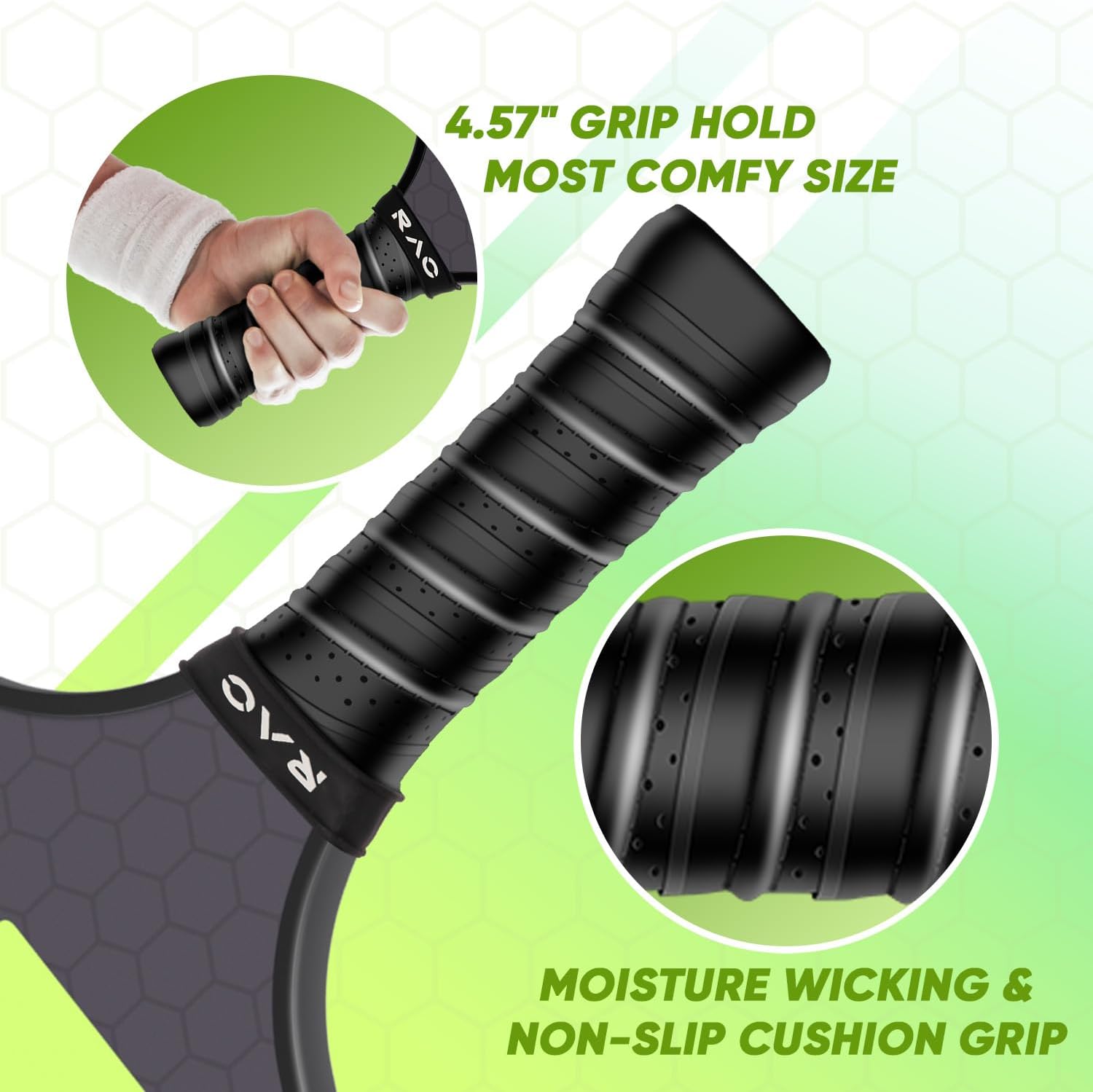 - 🎾【Shock-Absorbing Anti-Slip Handle Pickleball Rackets】The carbon fiber graphite pickleball rackets' handle features finely raised bumper ribs for secure grip, and spiral profile for precise grip and maneuverability. The perforated surface wicks away sweat, providing optimal traction and comfort while playing. The 4.57" grip circumference provides excellent grip so you won't feel fatigued after long gaming sessions.