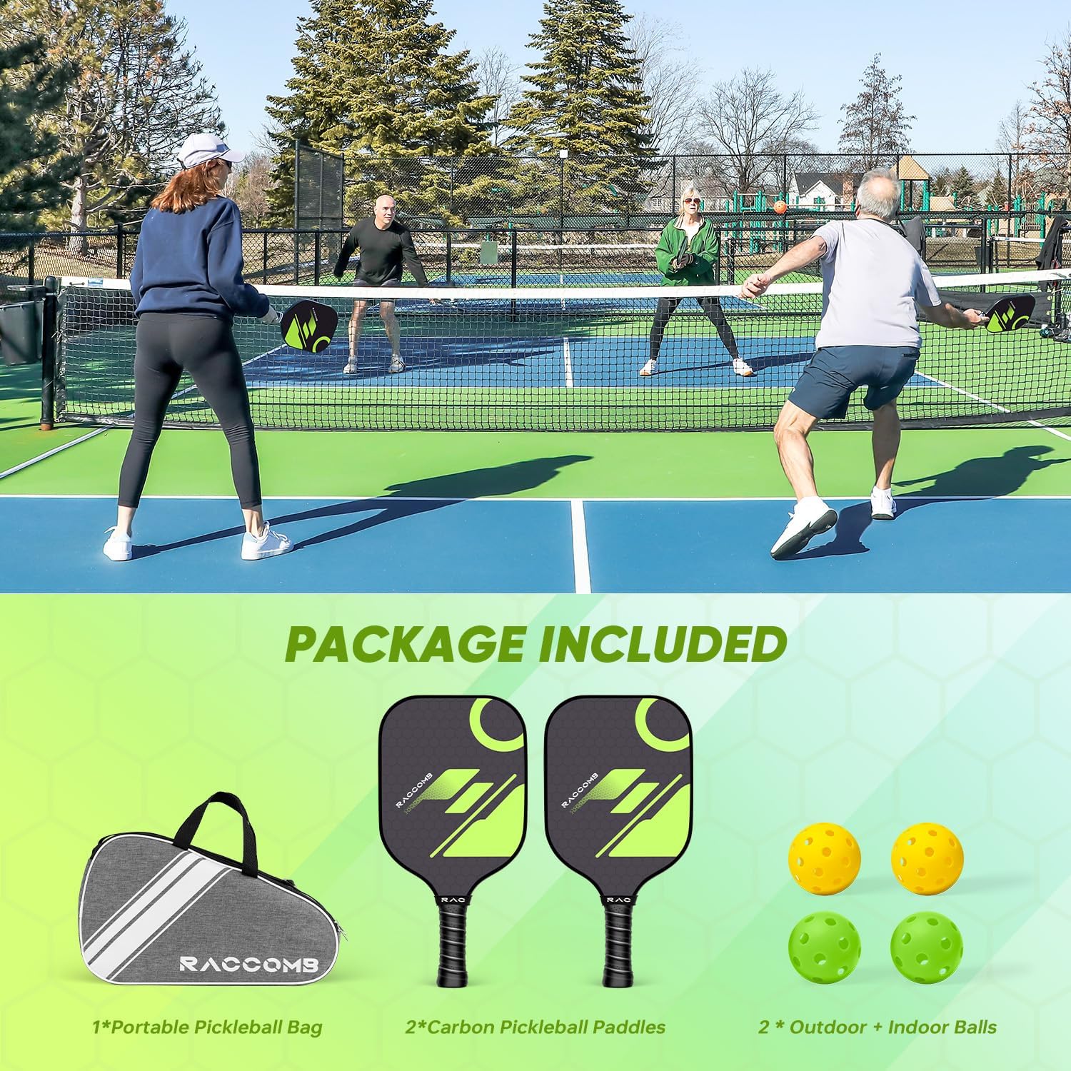 - 🎾【Carbon Fiber Pickleball Paddle Set of 2】These carbon fiber pickleball paddles graphite are designed with the latest carbon surface technology to give you ultimate control over your game, while the textured surface ensures improved spin consistency and pickleball control for unrivaled playing experience. Thicker core provides more control and larger sweet spot, also our honeycomb core technology absorbs hits and softens the feel for consistent speed and accuracy.
