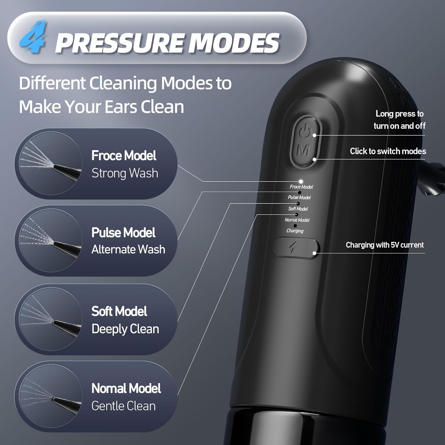 - 【Four Modes】Ear washer has four cleaning modes (normal, sofe, pulse, froce), which can be switched with one button. Select the desired mode after using warm water, you can start removing earwax.