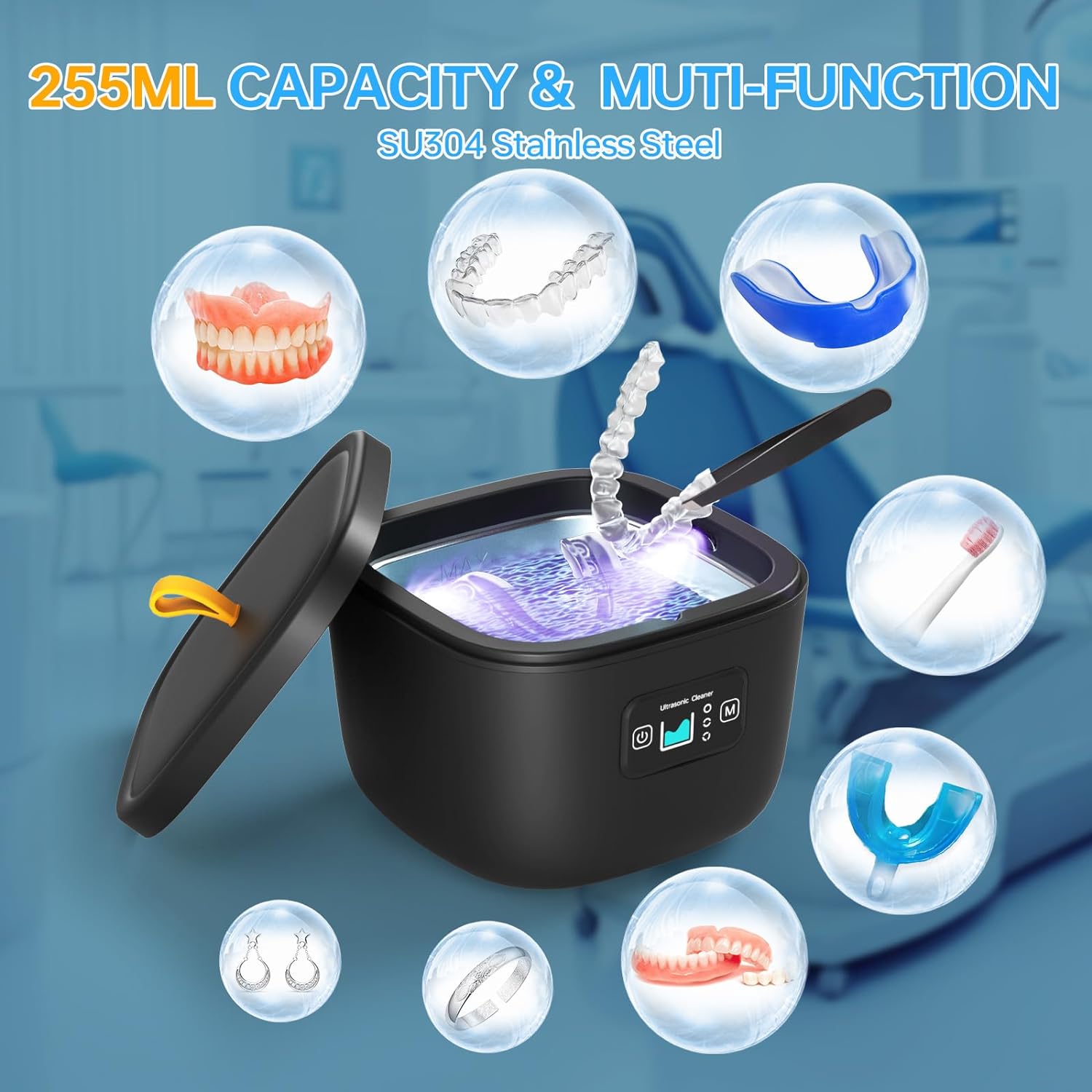 - Large 255ml Cleaning Capacity: With the spacious 255ML capacity, this ultrasonic retainer cleaner is tailor-made for cleaning night guards, dentures, orthodontic appliances, and retainers to delicate jewelry and precision watches. A comprehensive cleaning solution at your fingertips.